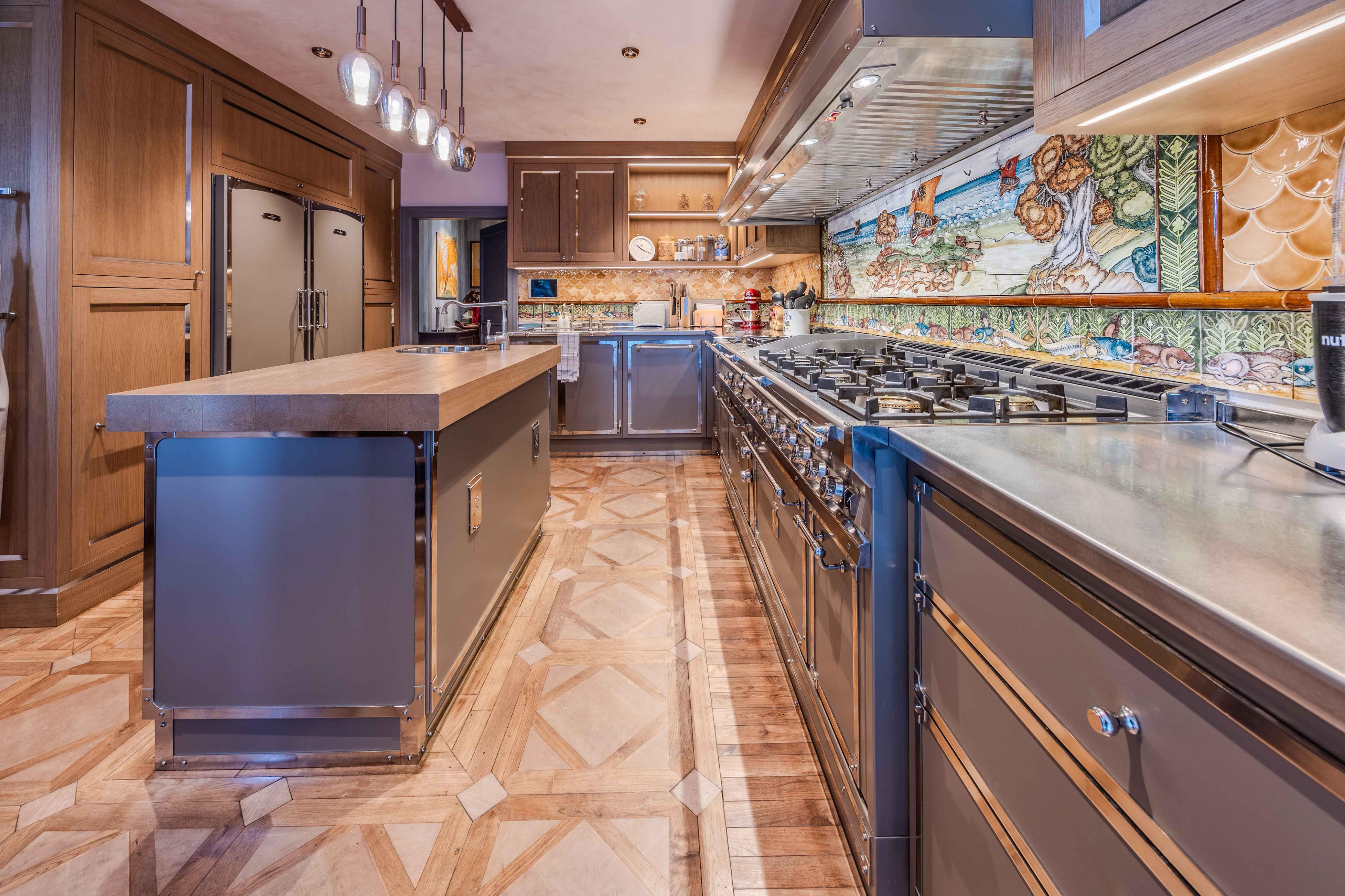 Rez-de-chaussée : vaste salon avec cheminée et hauts plafonds, salle à manger de réception, jardin d’hiver, bibliothèque, home cinéma, cuisine semi-professionnelle ouvrant sur la terrasse, chambre de service et accès direct à la piscine.
